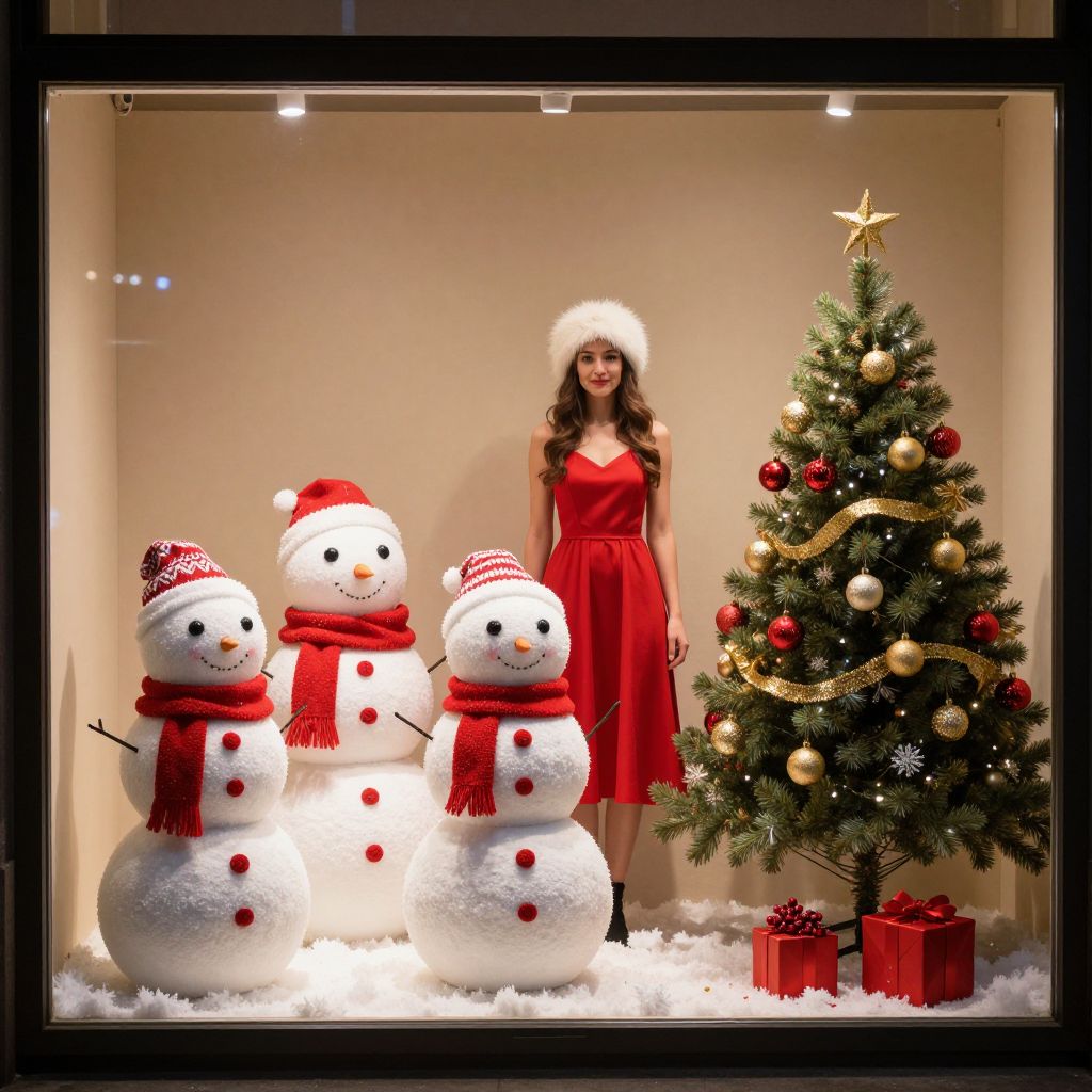 FCGS Christmas window display showcases a festive scene featuring three snowmen dressed in red scarves and hats, a woman in a red dress with a white fur hat, a decorated Christmas tree with gold and red ornaments, and a small red gift box with red berries, all illuminated by warm lighting against a beige backdrop.
