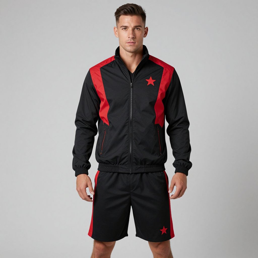 Photograph of a muscular, fair-skinned man with short, dark brown hair standing against a plain white background. He is wearing a black athletic tracksuit with red accents, including red star logos on the left chest and right thigh, and red stripes on the sleeves and sides. The tracksuit has a zip-up front and elastic cuffs. His expression is neutral, and he stands with his arms slightly away from his body. The overall style is modern and sporty, emphasizing the red and black color scheme.
