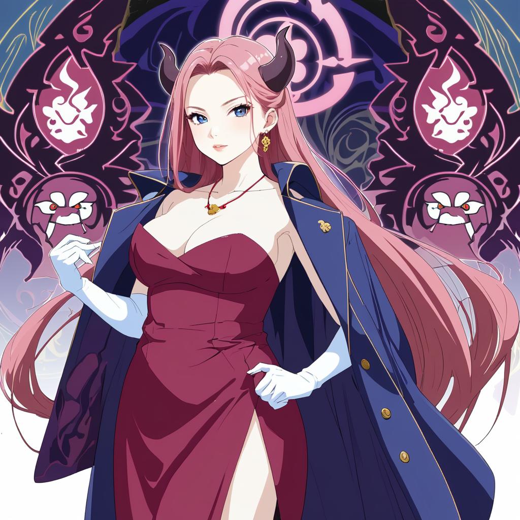 Digital anime-style drawing of a pink-haired demon woman with horns in a maroon dress and white gloves, and a dark-haired man in a blue coat