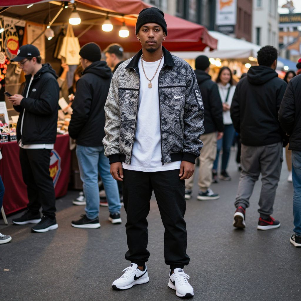 Nike tech roadman street style, blend of traditional roadman culture and contemporary techwear, vibrant street market environment, dynamic lighting from overhead lamps, detailed textures on jacket and sneakers, diverse urban crowd, high contrast
