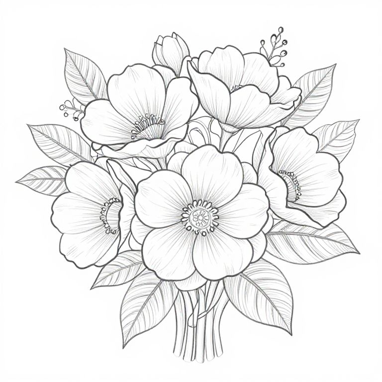Convert picture to outline drawing portraying a close-up of a delicate flower bouquet, capturing intricate petal shapes and leaf veins with precise continuous lines and soft hatching, evoking a botanical illustration vibe in grayscale.