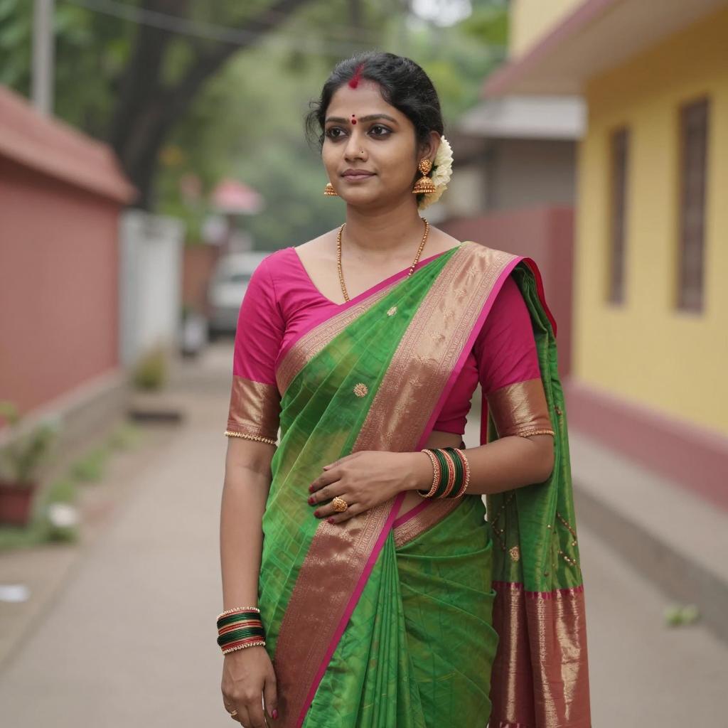 Portrait of an Indian woman standing outdoors on a narrow pathway, wearing a traditional green saree with pink and gold borders paired with a matching pink blouse. She has black hair styled in a simple updo adorned with white flowers, traditional gold earrings, green bangles, a gold necklace, and a red bindi on her forehead. The background features blurred green trees and walls painted in red and yellow.