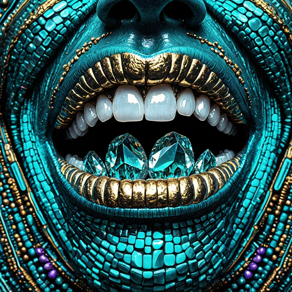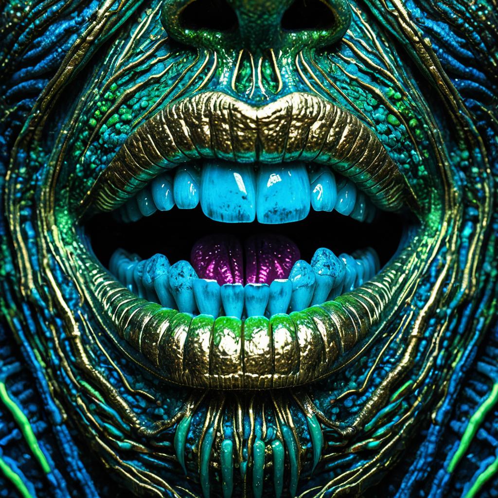 An extremely hyper-realistic, ultra-textural, surreal psychedelic entity with rows of human teeth, lips, and tongue, incorporating organic and mineral textures like Saprolegnia and structures such as crystalline patterns; translucent, with vibrant colors like pinks, yellows, and teals, extreme high definition, lots of light, compound psychedelic human eyes, surreal and trippy, highly detailed