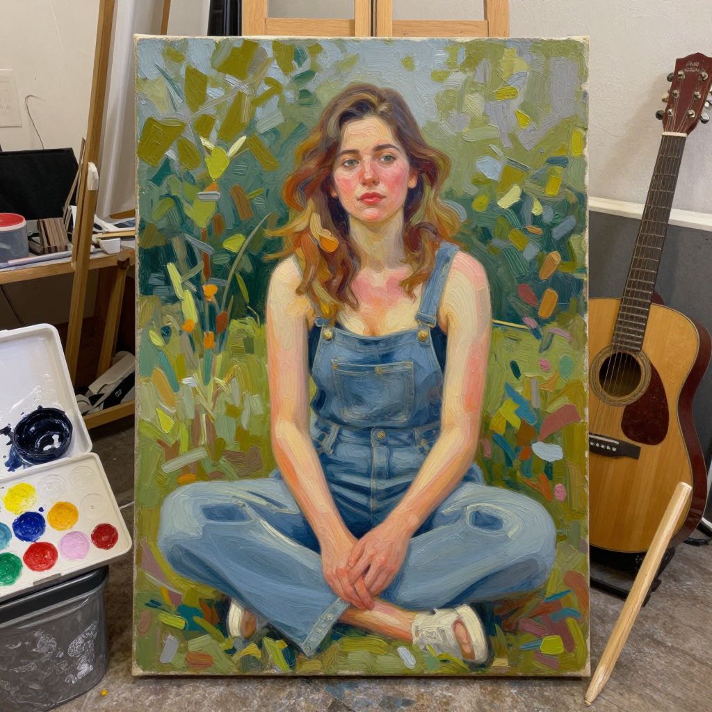 A woman surrounded by art supplies, music instruments, and nature, depicted in an oil painting with thick strokes.