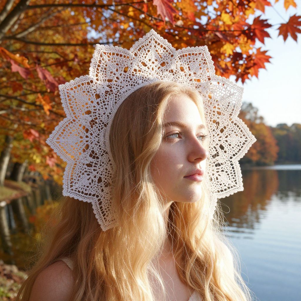 An ethereal portrait of a young woman with cascading golden hair, bathed in soft sunlight. Her delicate features are framed by an intricate lace mandala, seamlessly integrating her beauty with the overlaid design. In the backdrop, vibrant autumn leaves in shades of crimson and amber descend from towering trees, their reflections dancing on the serene surface of a nearby lake. As she gazes towards the horizon, the scene captures the fleeting beauty of life, inspiring introspection and a sense of wonder in those who behold it.
