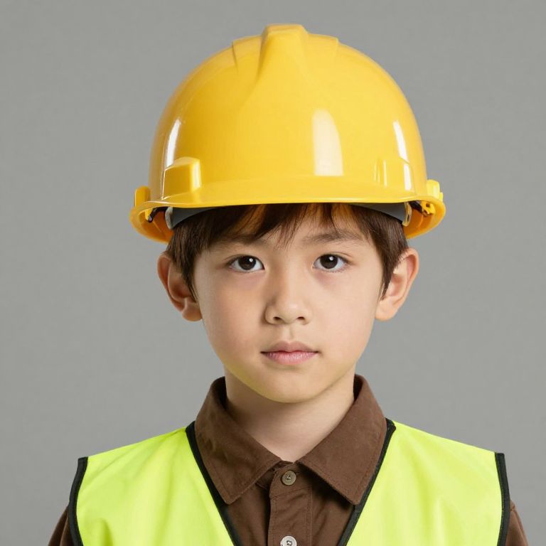 Boy with short brown hair wearing a yellow hard hat and a brown shirt with a yellow vest.