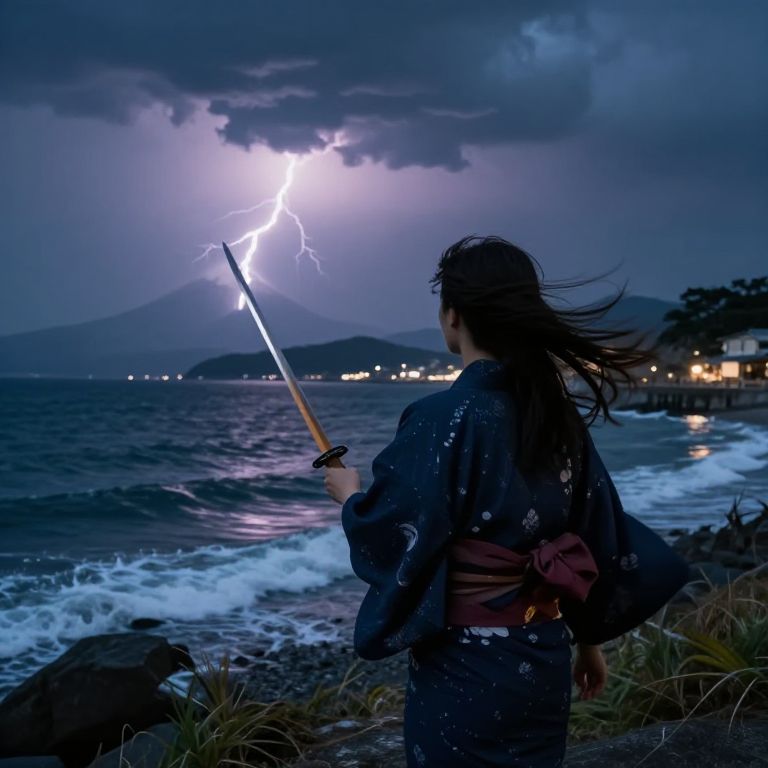 Furin-JP inside a stormy coastal village, facing the sea with a wooden sword, traditional kimono flowing in the wind, lightning flashing over Mount Fuji in the distance.