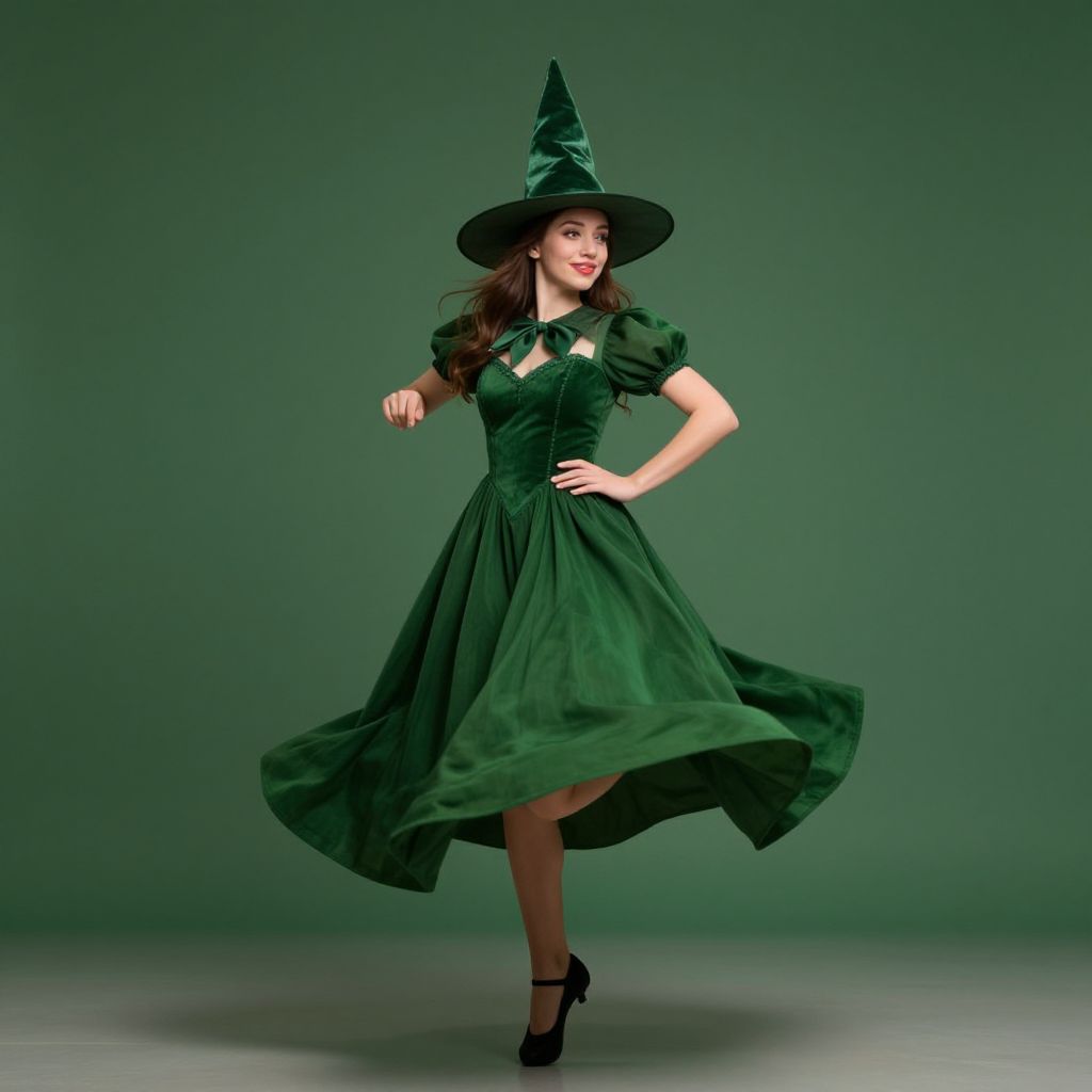 Glinda good witch dance, 1girl, solo, hat, dress, witch hat, green dress, hand on own hip, green headwear, full body, standing, black footwear, smile, long hair, puffy sleeves, short sleeves