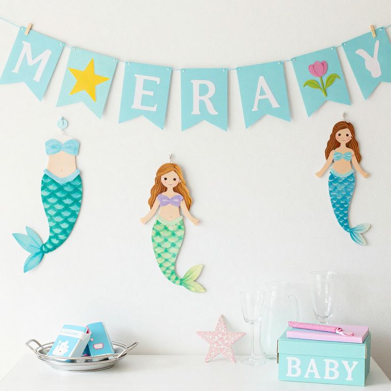 Photograph of a baby's room with a "Mermaid" banner, three mermaid cutouts, star and flower decorations, blue and pink gifts