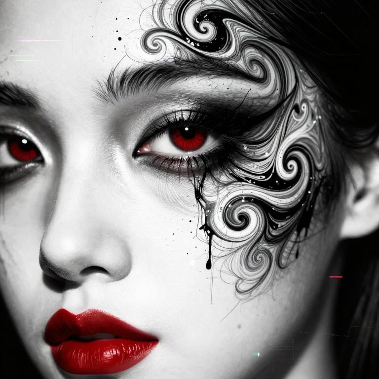 This is a digital, hyper-realistic portrait of a woman with striking red eyes and vivid red lips. Her face is in black and white, creating a dramatic contrast. Swirling black ink patterns are on her left cheek, and splatters of red blood are visible above her right eye. Her dark hair is partially visible, blending into the black background. The image has a gothic, surreal style, with intense, almost hypnotic eye contact. The detailed textures of her skin and makeup, combined with the stark color contrasts, give the portrait a haunting, ethereal quality.