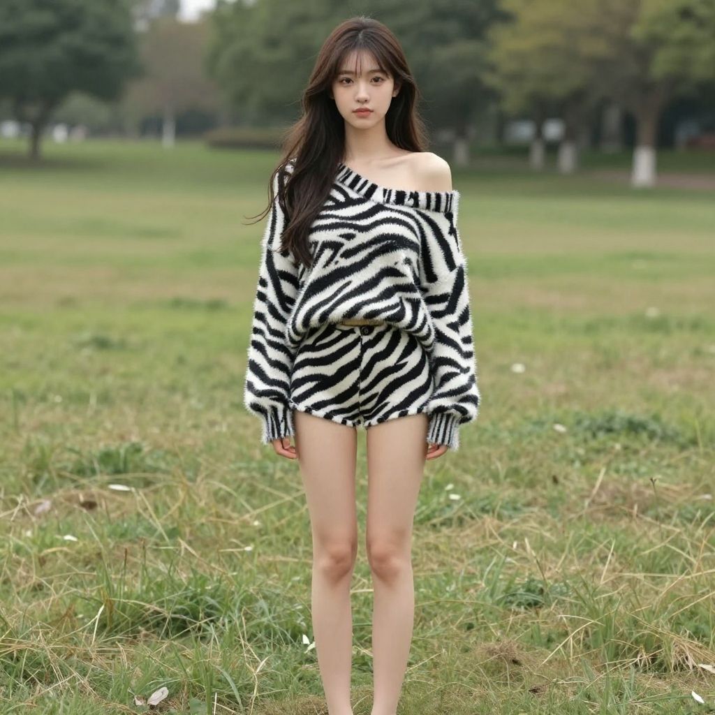 1girl, long hair, realistic, masterpiece, high detailed skin, looking at viewer, outdoor view, solo, full body shot, zebra print, off shoulder, fuzzy sweater, zebra print shorts