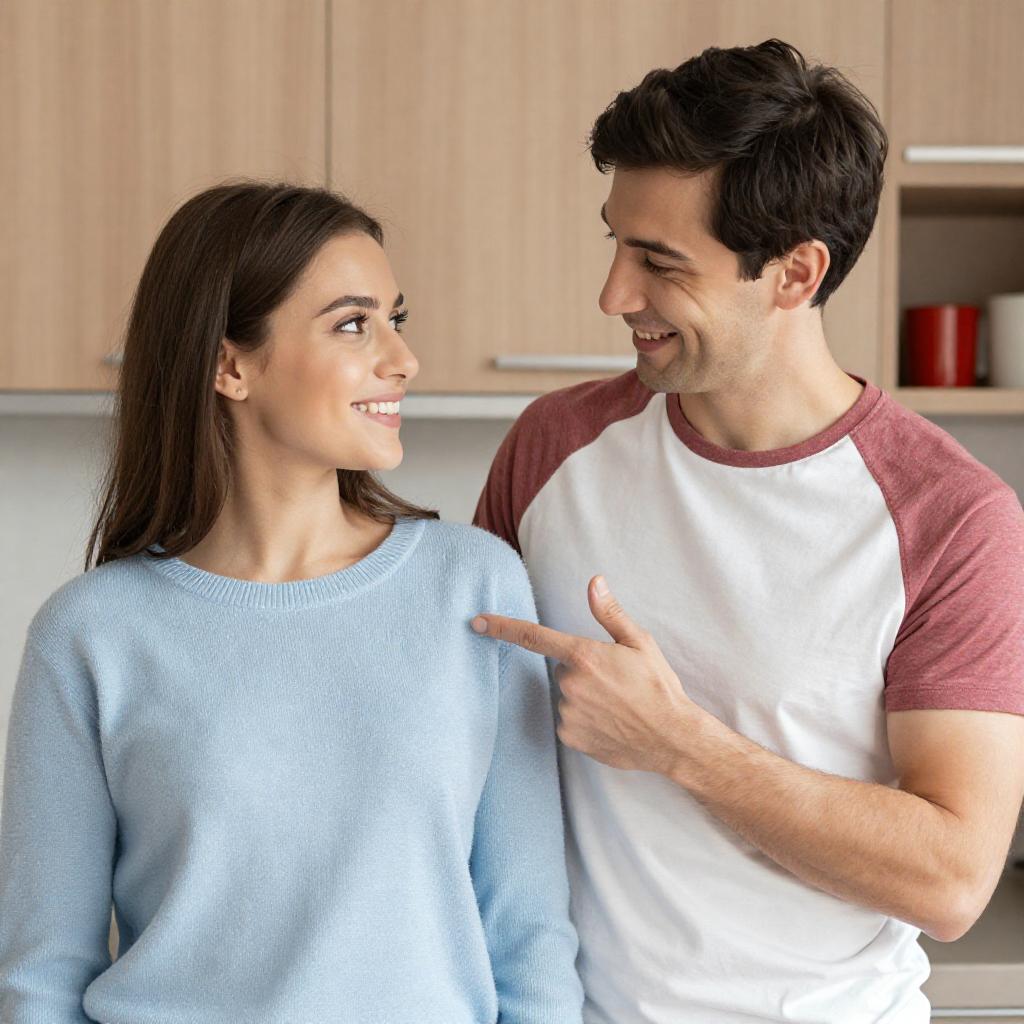 Photograph of a man with short black hair, wearing a light blue t-shirt, covering his face with his hands, looking distressed. A blonde woman with wavy hair, in a black top, stands behind him, smiling and gently resting her hands on his head. They are in a brightly lit, ornate hallway with decorative columns and a blurred background.