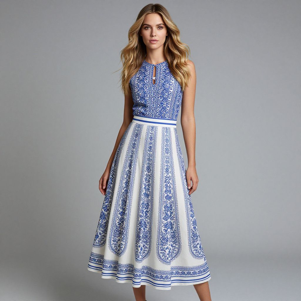 Woman with long blonde hair wearing a blue and white dress with a patterned skirt.