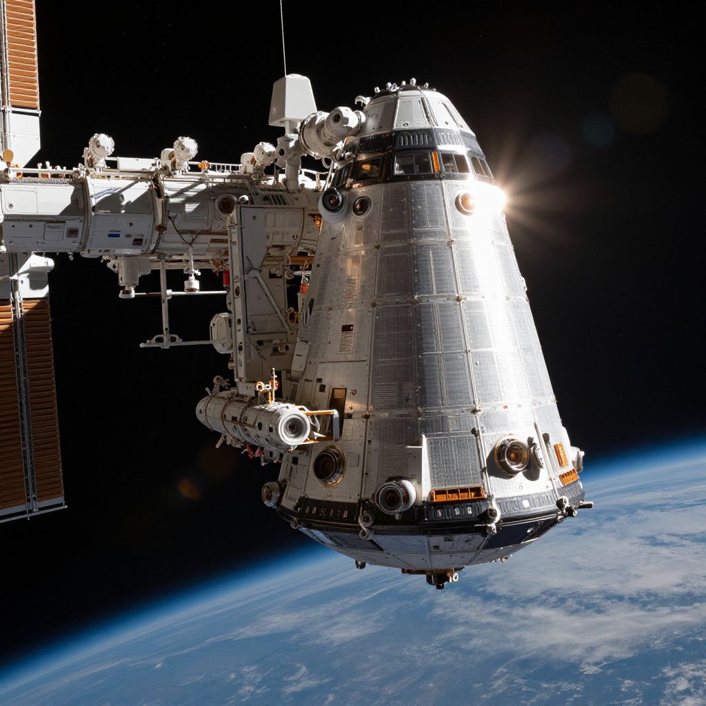 Starliner spacecraft docked at a massive orbital space station, detailed metal textures reflecting distant suns, intricate technology visible on the hull, starscape background with a glowing planet below, emphasizing advanced human deep-space travel.