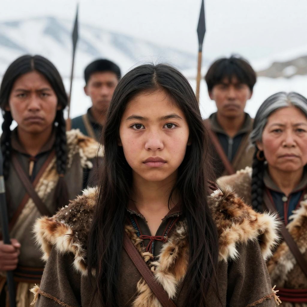 Photograph of five people standing in front of a ruined stone wall in a desert. Five individuals: two Black men, one in yellow shirt and pants, other in dark jacket and brown pants; one white woman with long hair, white pants, and brown top, holding a rifle; two Indigenous men, one shirtless, other in red skirt and headband. All serious expressions. Rifle held by woman is long and black. Background shows desert and distant mountains.