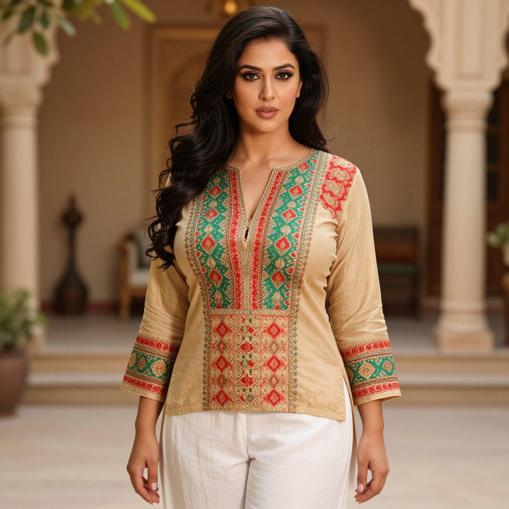 Photograph of a woman with long, wavy black hair and brown eyes, standing confidently in an indoor setting with beige walls and arched columns. She wears a beige, long-sleeved tunic adorned with intricate red and green embroidery on the front and cuffs, paired with white pants. Her makeup is subtle, emphasizing her eyes and lips. The background is slightly blurred, featuring a potted plant on the left and a wooden chair on the right. The lighting is soft, highlighting her attire and serene expression.