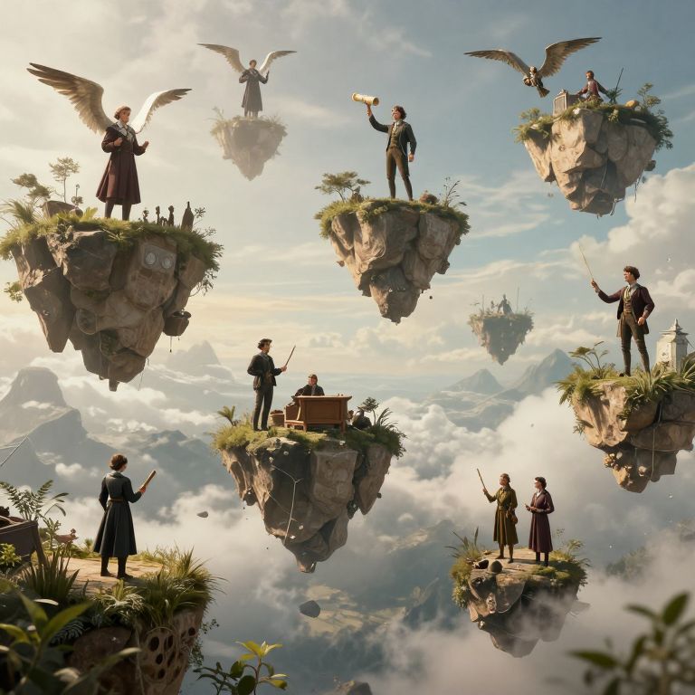 Time fragments into distinct, floating islands, each inhabited by events that never happened but could have—visited by historians wielding winged scrolls.