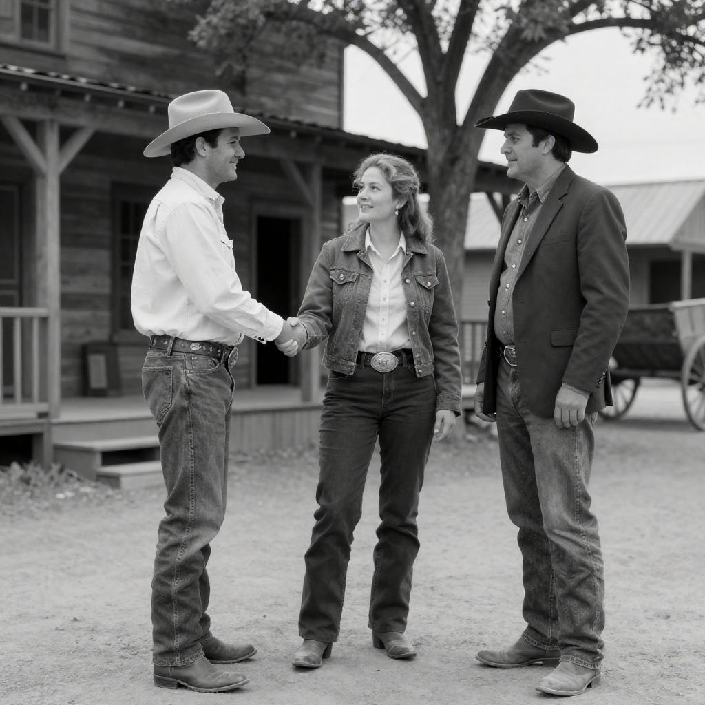 Photograph of a man and woman standing on a grassy field. Man in blue shirt, jeans, and brown hat, woman in pink shirt, black pants, and brown hat, holding a shovel. Red wheelbarrow with dirt pile in foreground. Tractor and wooden shed in background. Woman looking at man, man looking at woman. Casual outdoor setting.