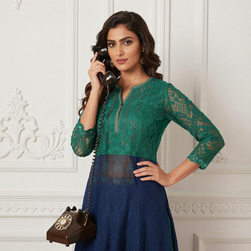 Photograph of a woman with fair skin and dark, wavy hair, wearing a green lace top and blue patterned salwar kameez. She stands against a white, ornate wall, holding an antique, brown telephone to her ear with her right hand. Her left hand rests on her hip. The background is brightly lit, highlighting the intricate details of her outfit and the telephone.