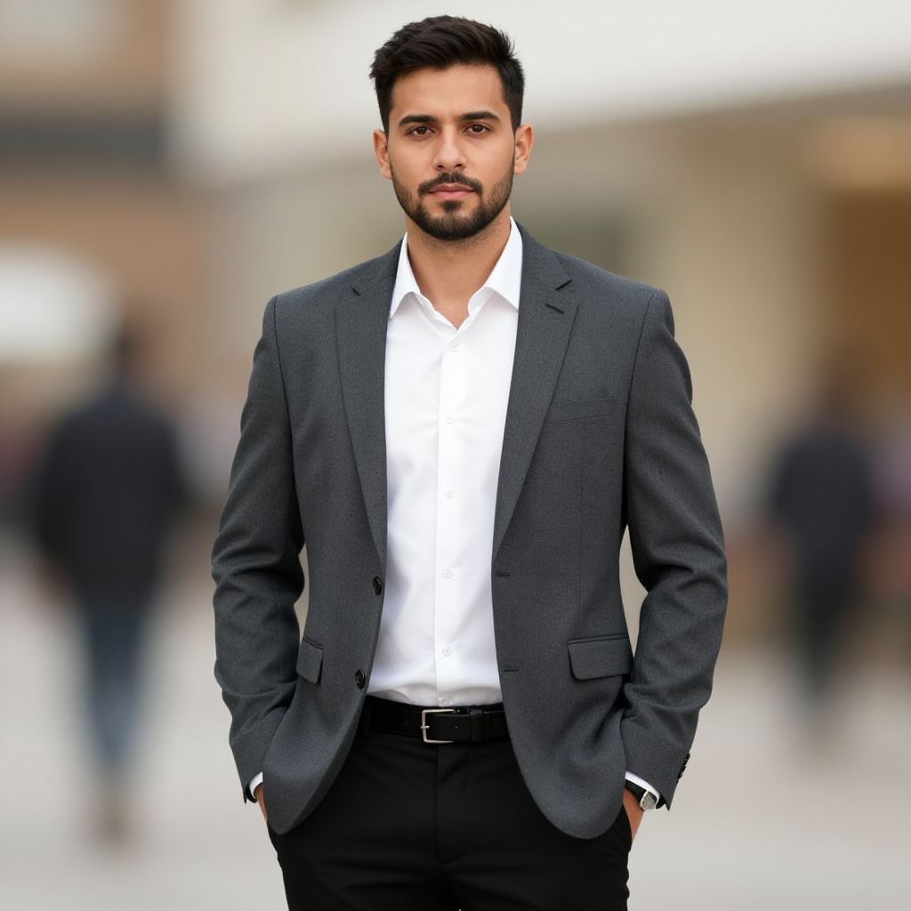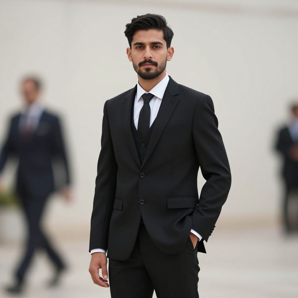 Cotton suit costume, 1boy, male focus, solo, facial hair, suit, jacket, formal, black hair, realistic, beard, pants, shirt, blurry, blurry background, standing, arms at sides, white shirt, white suit, collared shirt, long sleeves