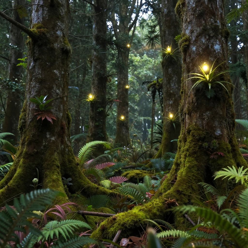 Hiper realismo fantasy forest scene, hyper-detailed moss, leaves, and tree bark textures, magical glowing light sources illuminating realistic flora and fauna, vivid and immersive