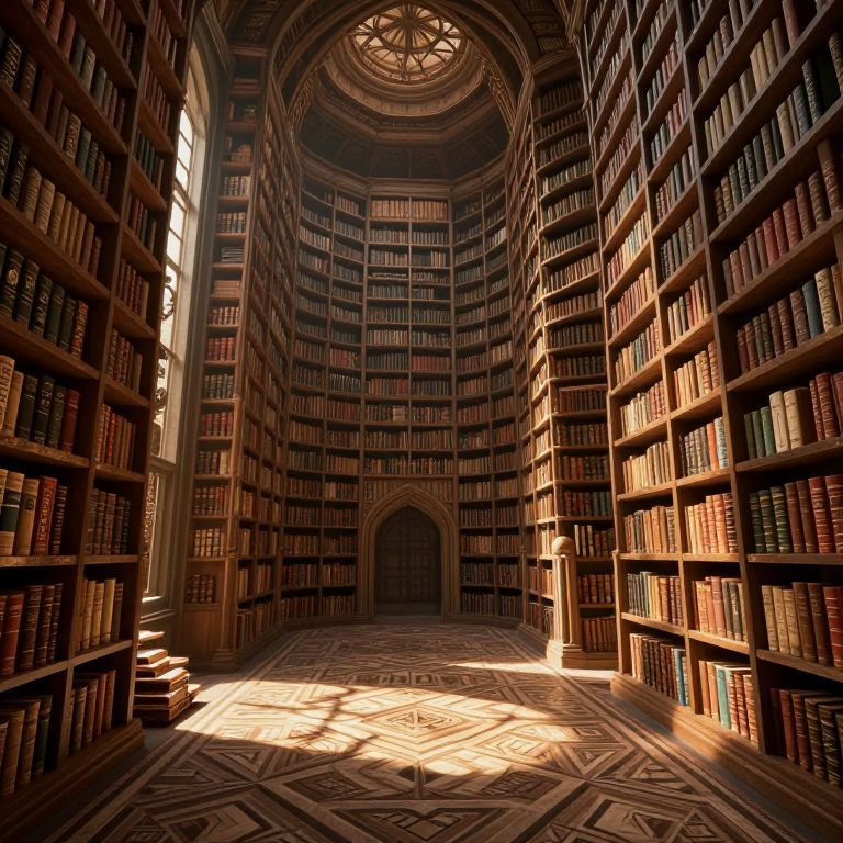 Photograph of a grand, sunlit library with towering bookshelves filled with books, arched ceiling, intricate floor pattern, and central arched