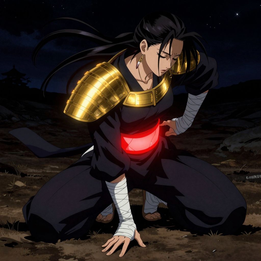 Fantasy stylised illustration, anime style, cinematic, full body shot, close up, dynamic pose, covered in shadows shinobi in a dark clothes, feudal Japanese background, kneeling in the dirt, mud, touching the ground with her hand, midnight, starry skies, baggy clothes moving on the wind, bright glowing gold pauldron striped through the whole body, huge glowing red waist, long fark gloves, white bandages on hands, eyes closed, looking down, expressionism, stature is agile and very graceful, woman, incredible, style of Edwin Austin Abbey