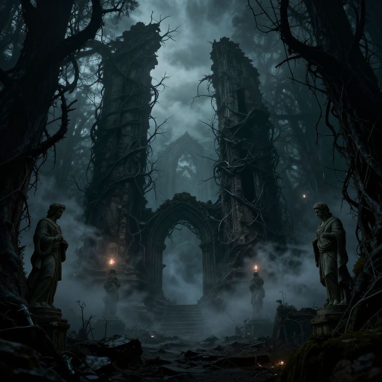 Dark fantasy ruins deep within a cursed forest, crumbling towers entwined with black thorny branches, flickering spectral lights floating around shattered statues, ethereal mist weaving through the ruins, dark moody colors, rich texture and mystical ambiance.