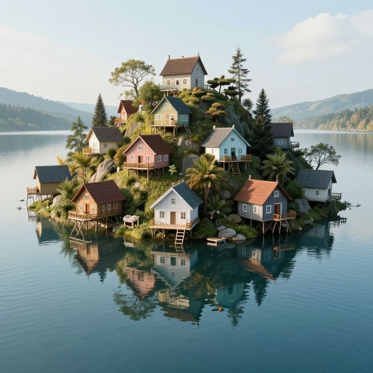 Photorealistic digital artwork of a picturesque island featuring a cluster of colorful wooden houses with red and blue roofs, surrounded by calm, reflective water and lush