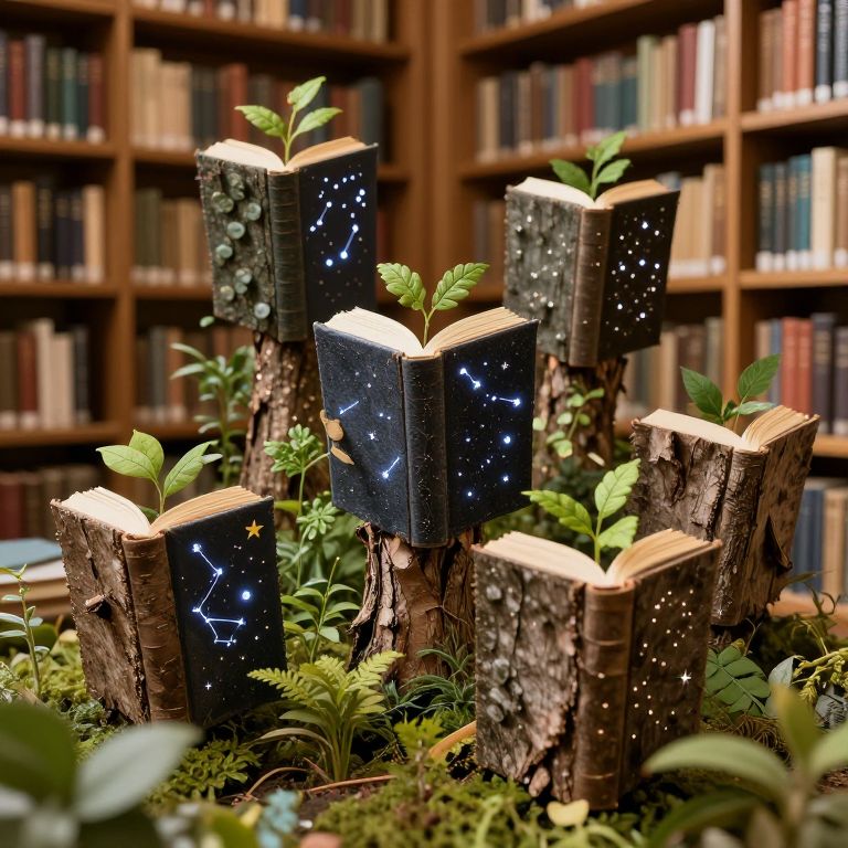 A librarian tends to a garden of whispering books, each bound in living bark and sprouting constellations upon opening.