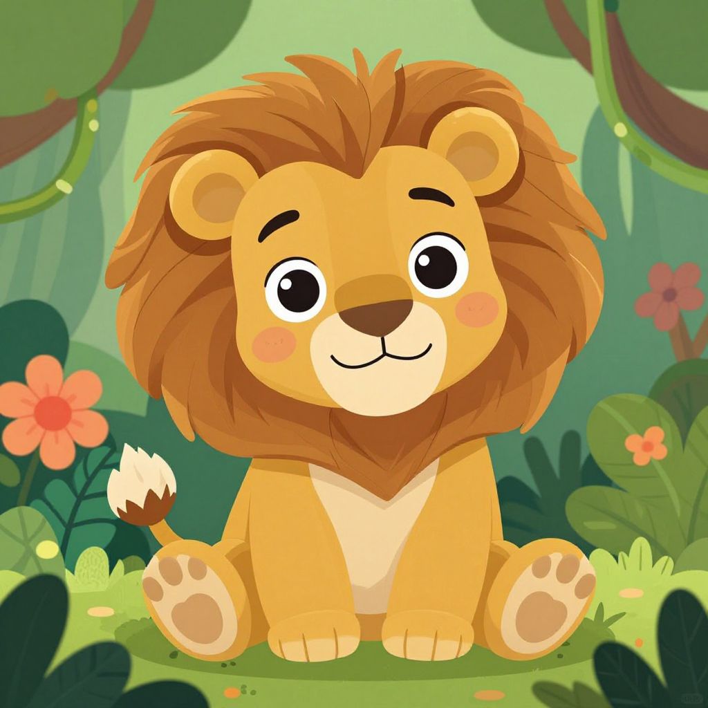 Cute cartoon lion with a brown mane, big black eyes, and pink cheeks sits in a vibrant, green jungle with colorful flowers. Digital illustration.
