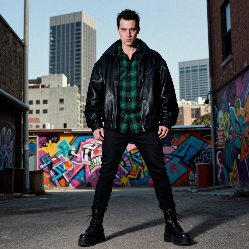 A man, goth aesthetic, oversized black leather jacket, green and black plaid shirt, skinny black trousers, platform boots, concrete jungle skyline, vibrant murals on lower levels, shadowed alleyways, chromogenic film style, intense expression. Man has masculine face and piercing eyes