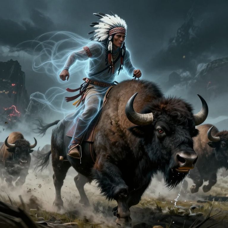 Comic book style 8k high quality digital painting, best quality very detailed epic masterpiece, sice view, a ghostly transparent specter of a Native American, Indian, is riding on a big buffalo, the buffalo is very anxious, saliva on its snout, many othe buffalos running in the background stampede, dramatic sky, night, scary scene, action, scary, epic scene, Dungeons and dragons atmosphere, heroic fantasy, fnastyle, Comic book style
