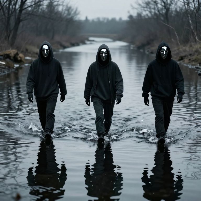 Photograph of three masked men walking through a shallow, reflective, dark blue river. Each man wears a black hooded jacket and dark pants, with white, reflective masks covering their faces. The men are centered in the image, with water splashing around their legs. The background features a blurred, leafless forest and a distant, foggy bridge. The overall mood is eerie and mysterious, with high contrast and a cool, blue-toned color palette. The men's reflections are visible in the water, adding to the surreal atmosphere.