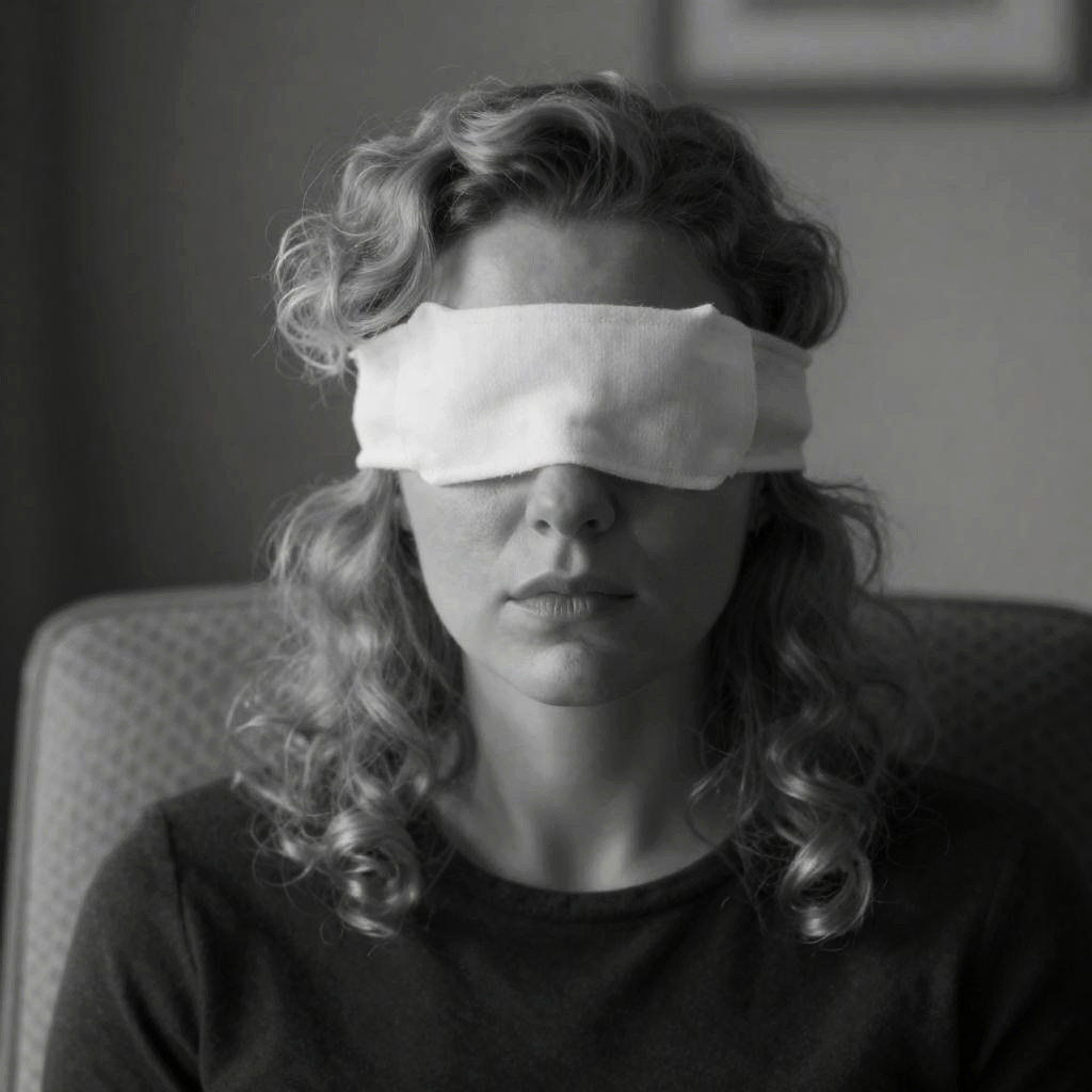 Woman with long brown hair, lying on gravel, bound in orange dress with arms tied behind back. Man in blue pants stands nearby. Two black tools lie on ground to left. Woman's face shows discomfort. Gravel-covered ground extends.
