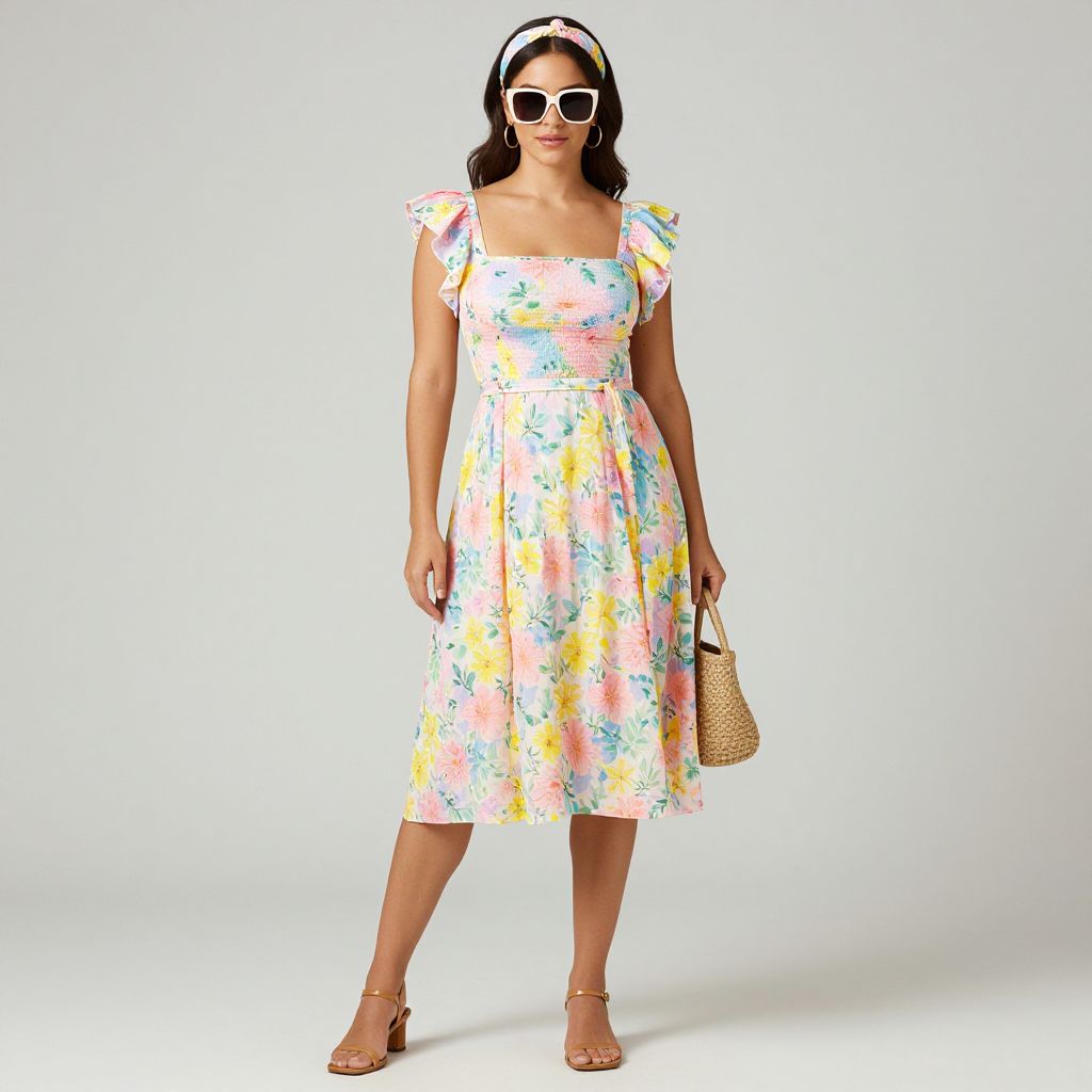 Full body shot, woman, vibrant floral print dress, lightweight cotton fabric, knee-length, fitted bodice, flared skirt, delicate ruffled sleeves, pastel color palette, soft pinks, bright yellows, green leaves, cinched waist with a thin belt, matching floral headband, strappy sandals, tan leather, small heel, woven handbag, natural fibers, oversized sunglasses, gold hoop earrings, playful and fresh vibe Sexy. Pretty face and beаutiful eyes. Big breasts