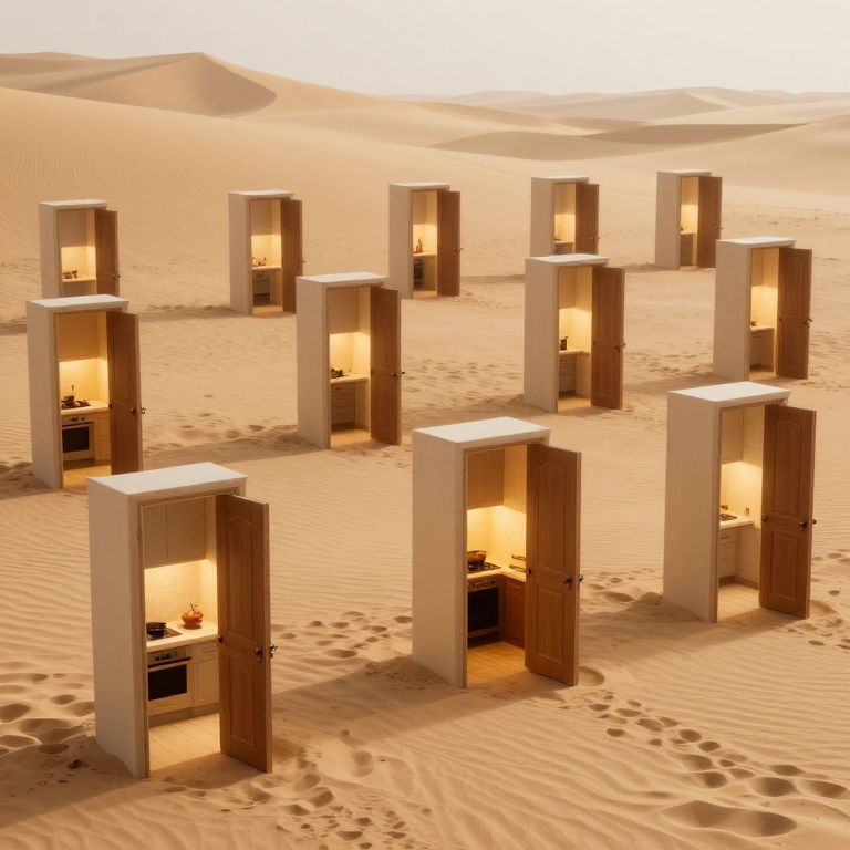 In a surreal expanse of sand, rows of doors stand as silent sentinels, their rhythmic opening and closing hinting at hidden worlds within—each kitchen a paradox of warmth and mystery, where the air carries the faint, intoxicating aroma of dreams cooking themselves.