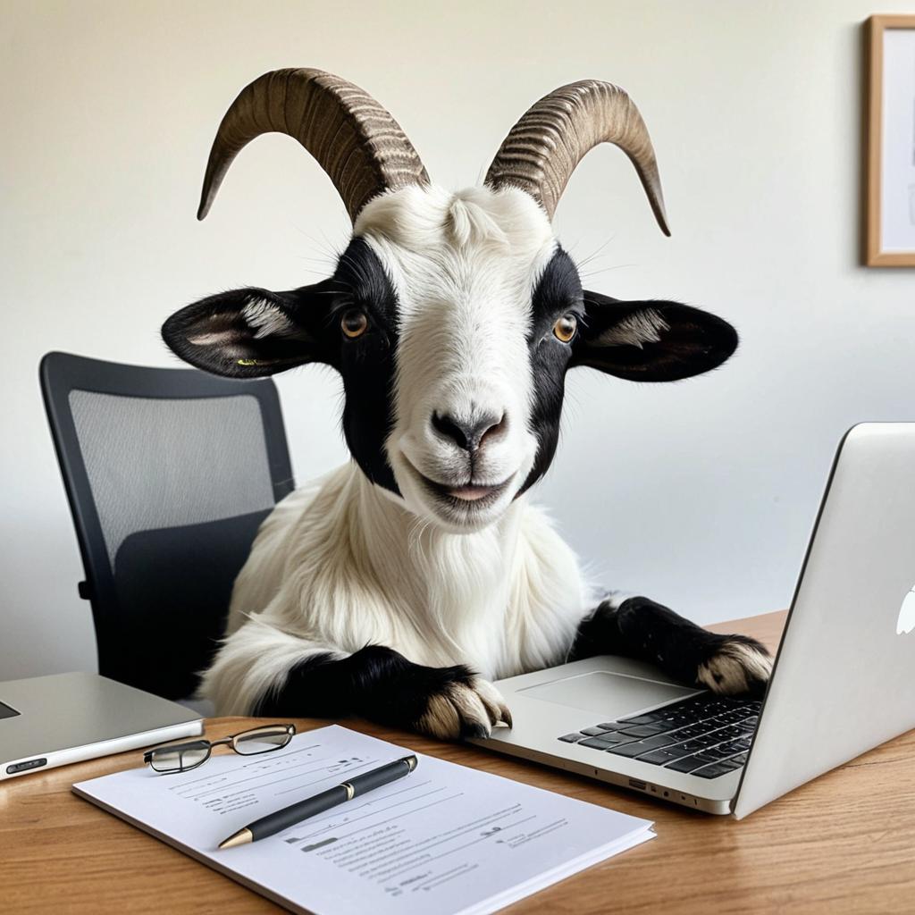 Create a cute and clever cartoon goat portrait, sitting at a desk with a laptop and resume. The goat should exude confidence and intelligence while maintaining neutral facial features in a lighthearted atmosphere.