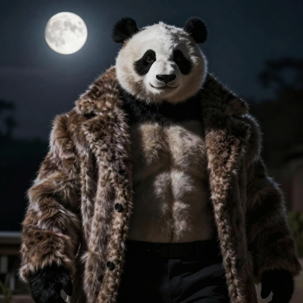 (masterpiece, best quality, highres:1.2), (photorealistic:1.2), (Realistic fur texture:1.4), raw photo, (1 friendly anthropomorphic panda man), muscle, man kind pandaman, furry, in high detailed dressed in a coat, in an elegant evening dress, really wild fur, dramatic scene, (detail fur texture, ultra-detailed body), moonlight passing through fur, (night beautiful background:1.3), dim light, dawn, (sharp), (film grain:1.3), (morbid light:1.2), (dynamic angle), award winning photography, exposure blend, bokeh, (hdr:1.4), high contrast, (muted colors, dim colors, soothing tones:1.3), low saturation, morbid