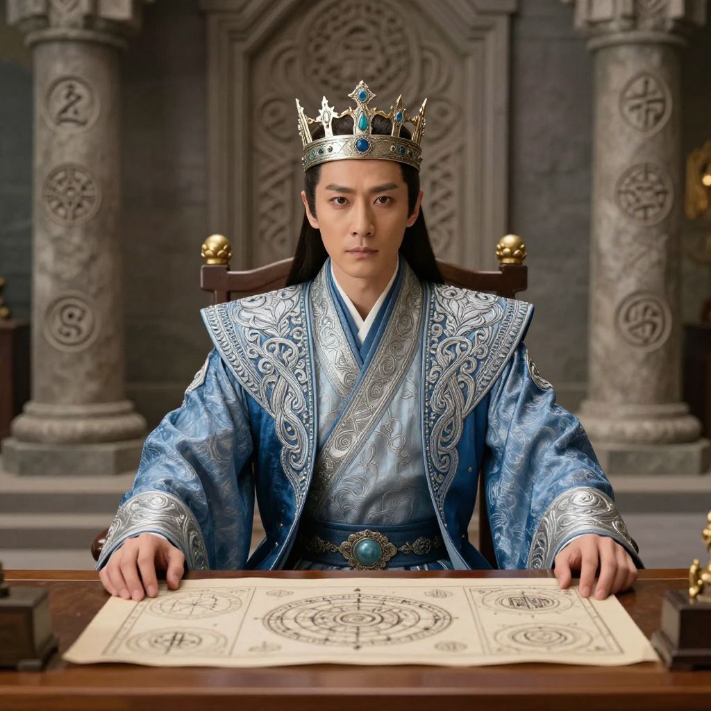 Male wearing a red robe with gold embroidery and a crown on his head.
