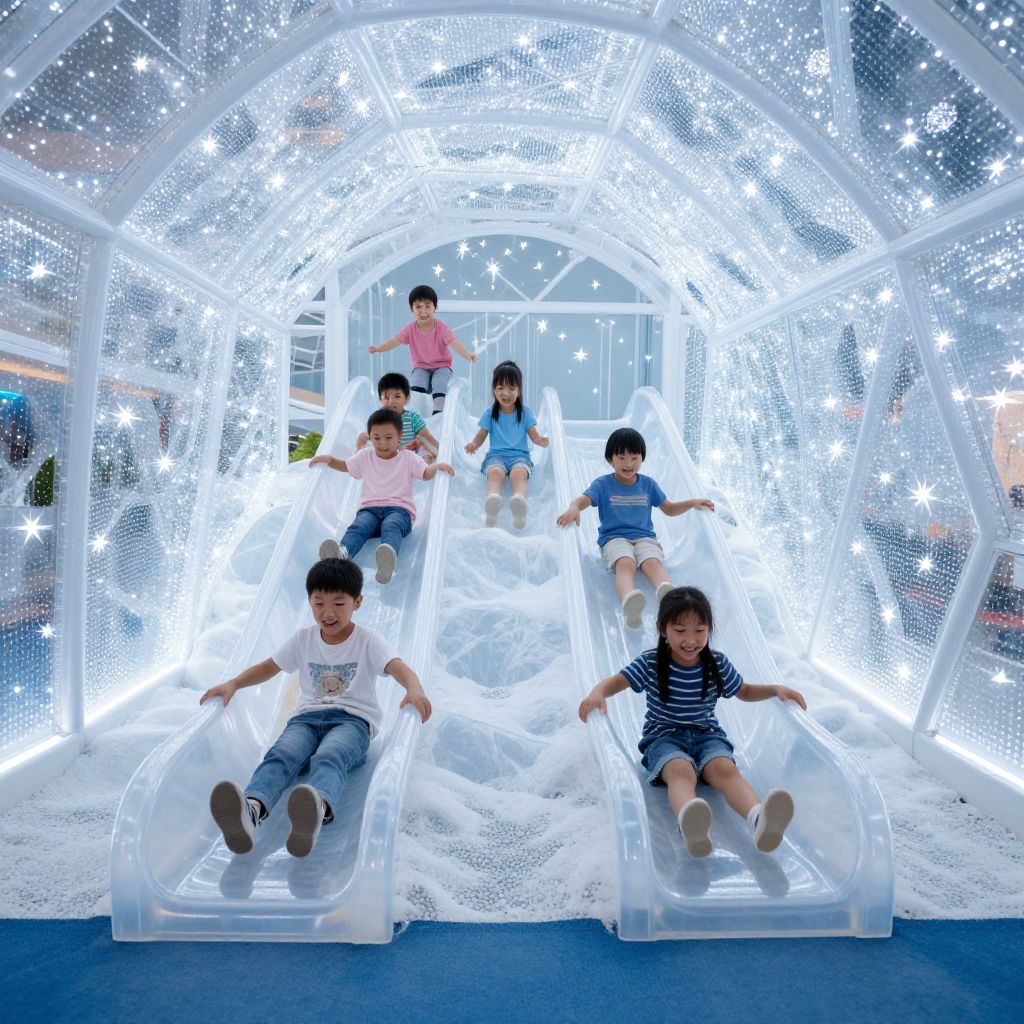 Photograph of six Asian children riding clear plastic sleds through a glowing, starlit, white tunnel in a brightly lit indoor setting.