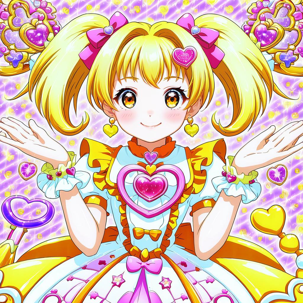 Colorful anime-style illustration of a cheerful magical girl character with bright blonde twin tails tied with pink bows. She wears a vibrant yellow and white costume adorned with hearts and frills, including heart-shaped earrings, a pink heart hair ornament, wrist cuffs, and an orange choker. The background features sparkling heart motifs, enhancing the magical theme.