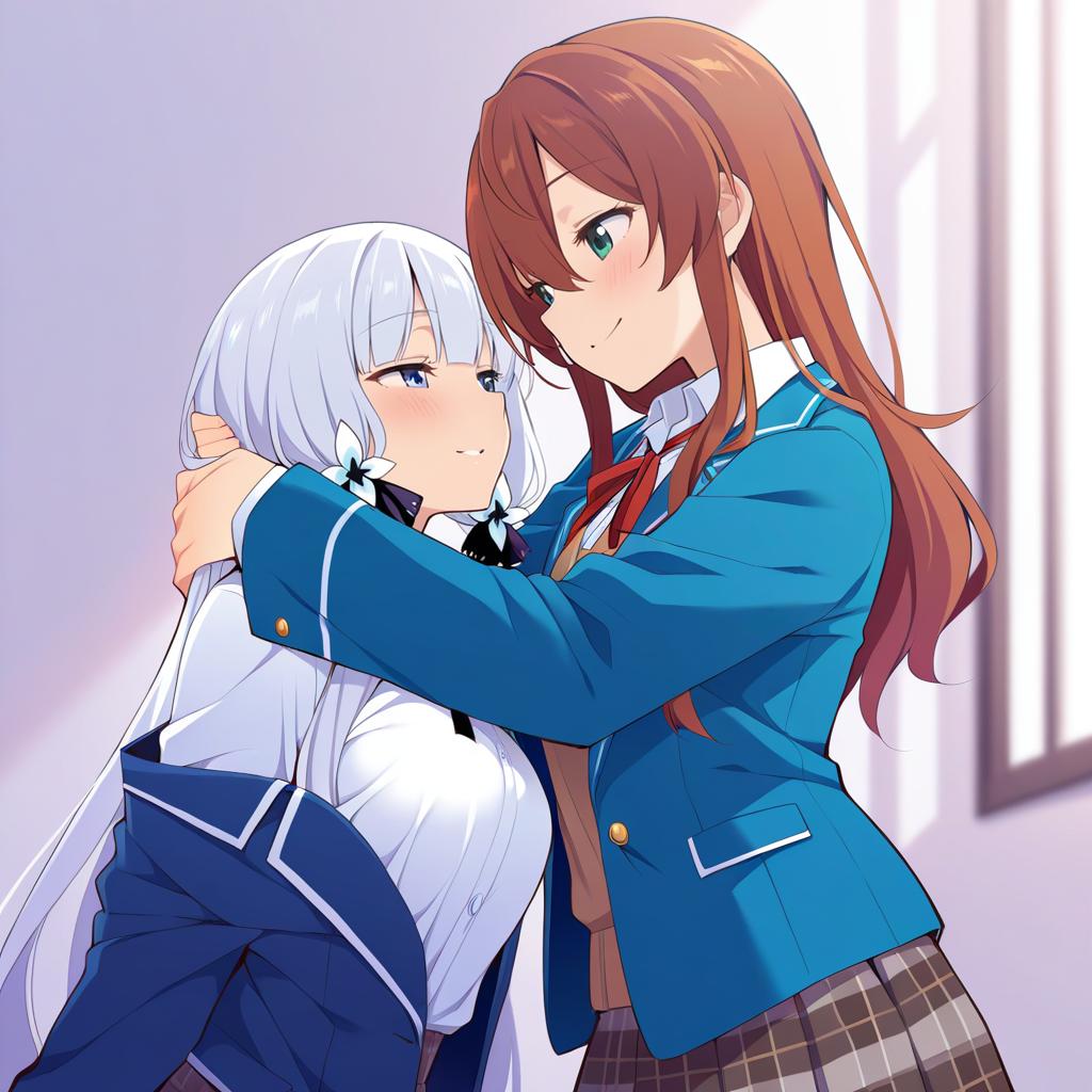 Illustration of two anime girls in Yumenosaki school uniforms embracing indoors. One girl has long brown hair, green eyes, and wears a blue blazer with a red ribbon tie and plaid skirt. The other girl has long white hair with blue eyes and flower hair accessories, also dressed in a blue school uniform jacket over a white collared shirt. They share a tender moment in soft natural lighting.