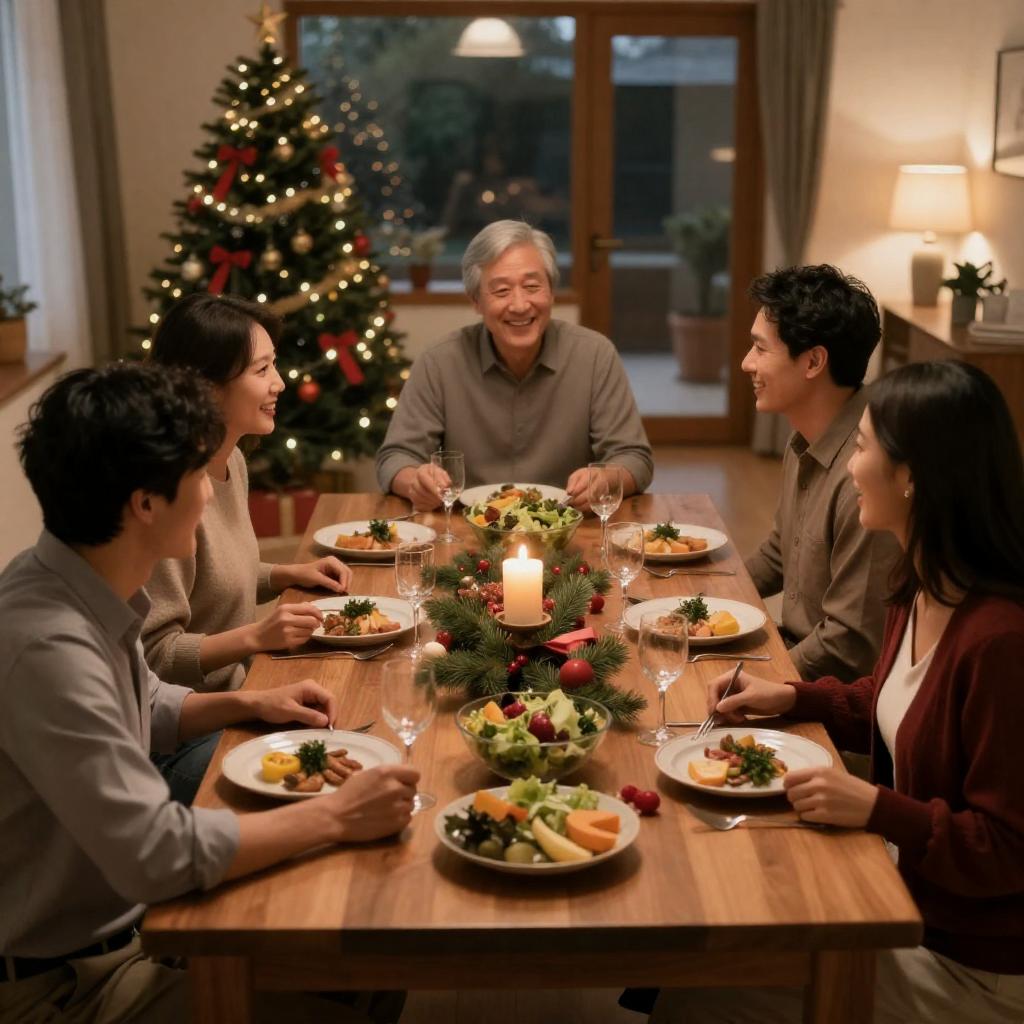 Photograph of a festive family dinner in a warmly lit, wooden-furnished dining room. Six people, three men and three women, sit around a wooden table adorned with Christmas decorations, candles, and a bowl of salad. They are engaged in conversation, smiling, and enjoying their meal. A decorated Christmas tree and red ribbons are visible in the background.