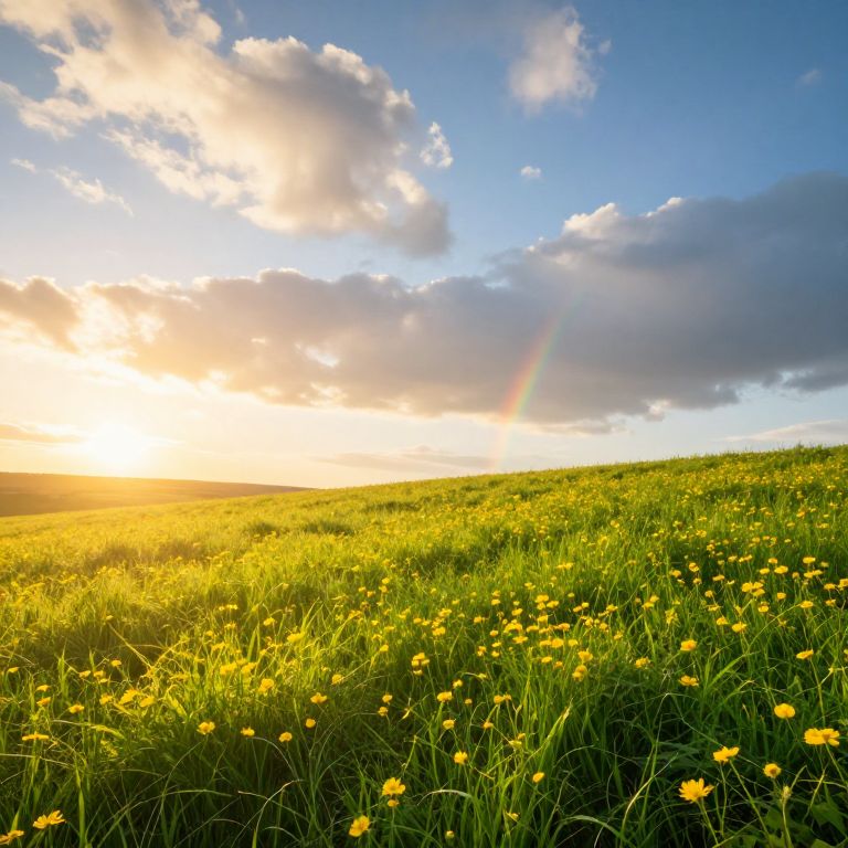A serene digital landscape captures a vibrant meadow bathed in the golden glow of sunrise, where lush green grass and scattered yellow wildflowers sway gently under a sky adorned with fluffy clouds and a subtle rainbow, evoking a harmonious blend of natural beauty and celestial serenity.