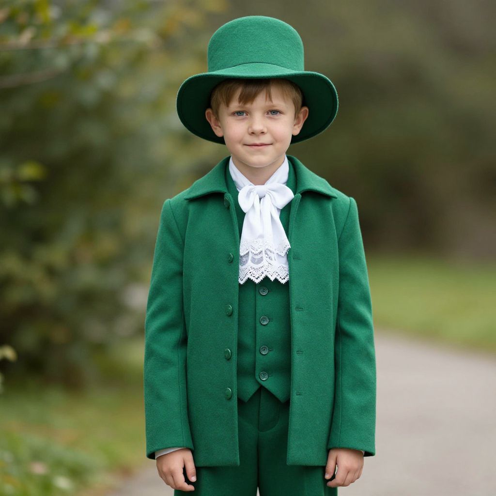 Stephens Green Costume, young boy wearing a hat and a green coat