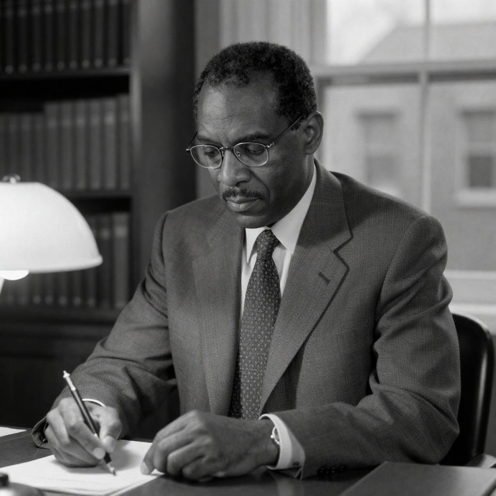 Black and white photograph of a middle-aged Black man with short hair, glasses, and a serious expression. He wears a ured suit jacket, white shirt, and patterned tie, sitting at a desk with a lamp. Bookshelves and a window with an outside brick building are in the background. He is writing with his right hand.