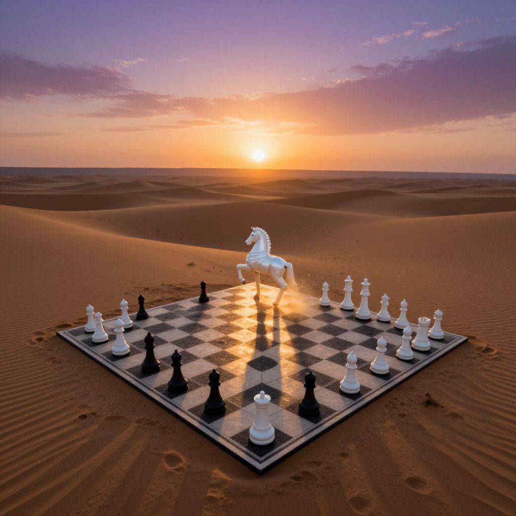 Photograph of a chessboard with white and black pieces, topped by a white horse knight, set in a desert at sunset.