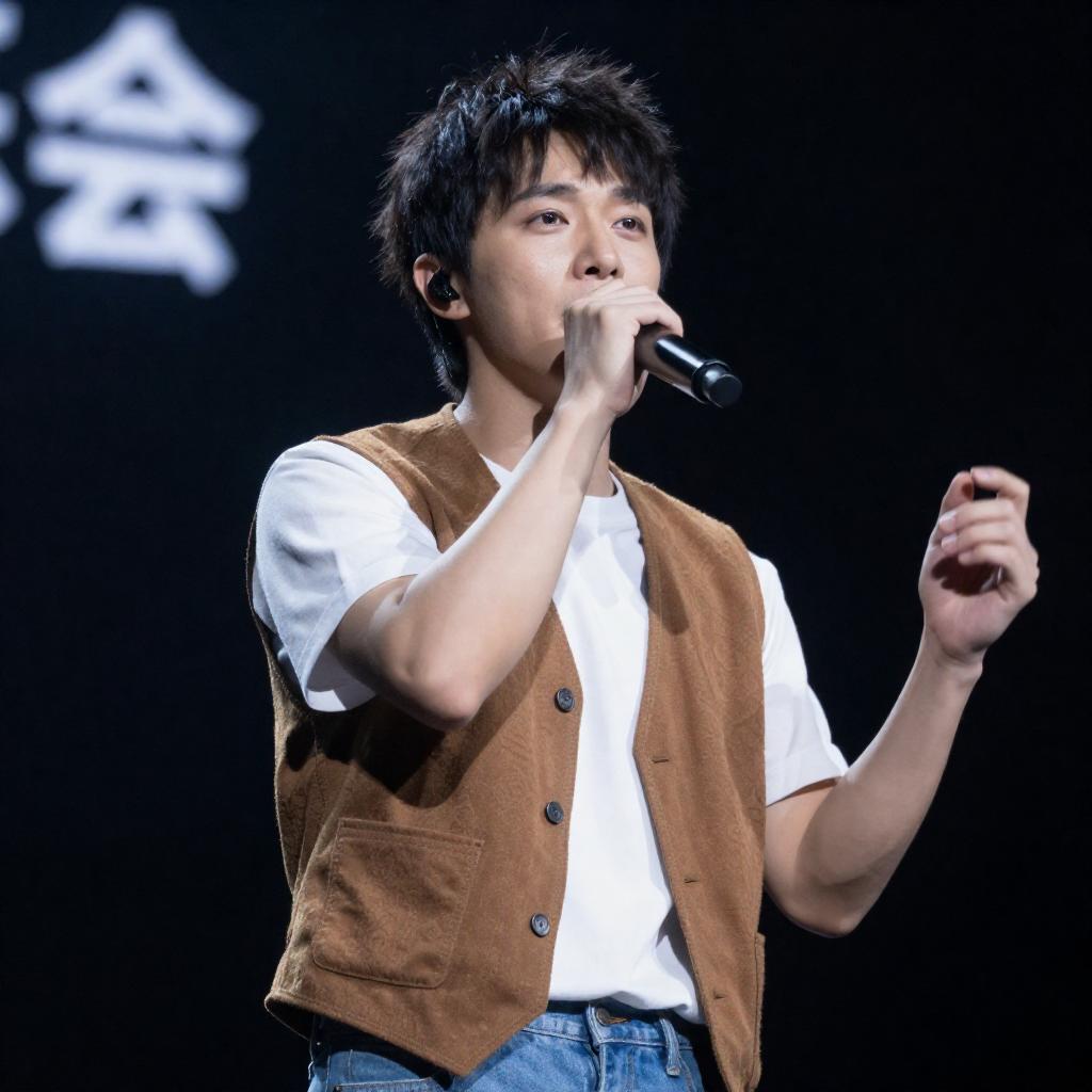 Photograph of a male musician with dark hair, wearing a white, glittery, bell-bottom suit, holding a microphone in his right hand and an acoustic guitar in his left. He stands on a stage with a dark curtain background, illuminated by stage lights, and a drummer is partially visible behind him.