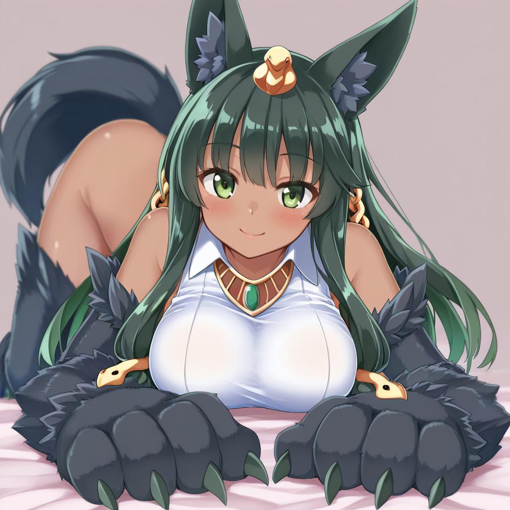 Anubis (monster girl encyclopedia), monster girl encyclopedia, 1girl, monster girl, dark-skinned female, wolf ears, wolf tail, tail, jackal ears, red eyes, green eyes, long hair, green hair, black hair, snake hair ornament, large breasts, animal hands, claws, by artist sekiguchi miiru, illustrious